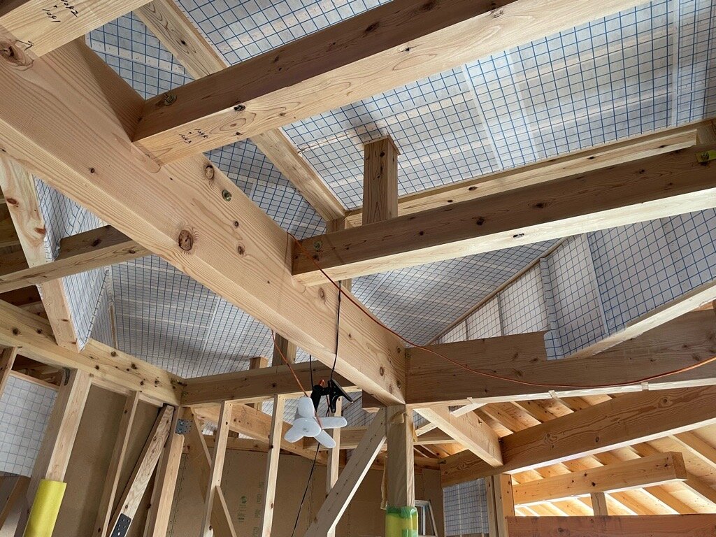 - こちらのお宅なんですが、平屋2.5棟分以上はあるであろう大きさです。図面を見た段階ですごいお家になることは分かっておりましたが実際には上棟した躯体を見ると圧倒されました。断熱材は屋根・壁ともにデコスドライ工法を採用していただきました。ありがとうございます。